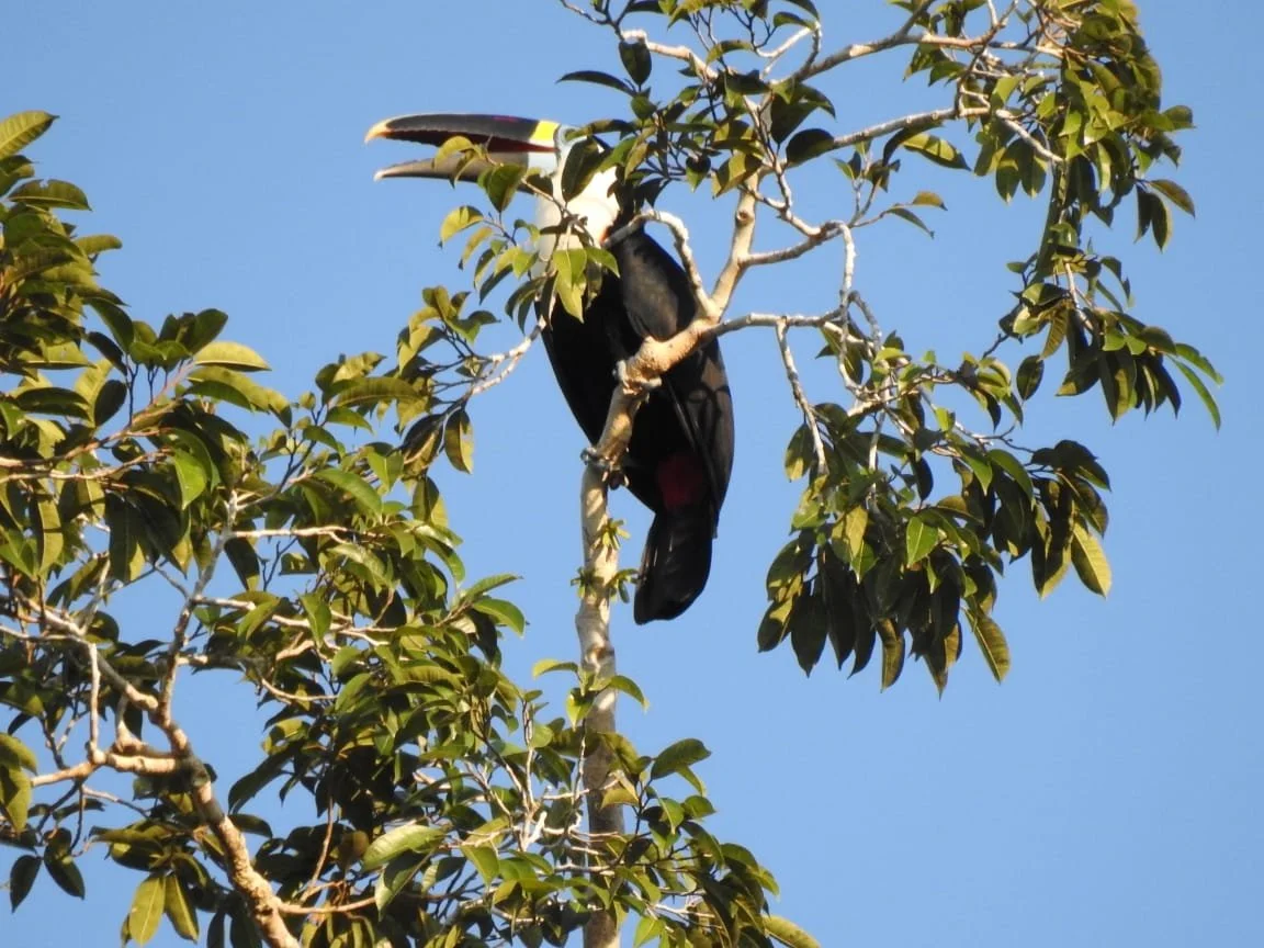 These habitats are filled with highly social, vocal and active birds whose-day to day life revolves around foraging, communicating , and nesting. Chestnut-eared aracaris prefer to travel in flocks of up to a dozen or more. They are most active during the cooler hours of the day. Most of this time goes to foraging.