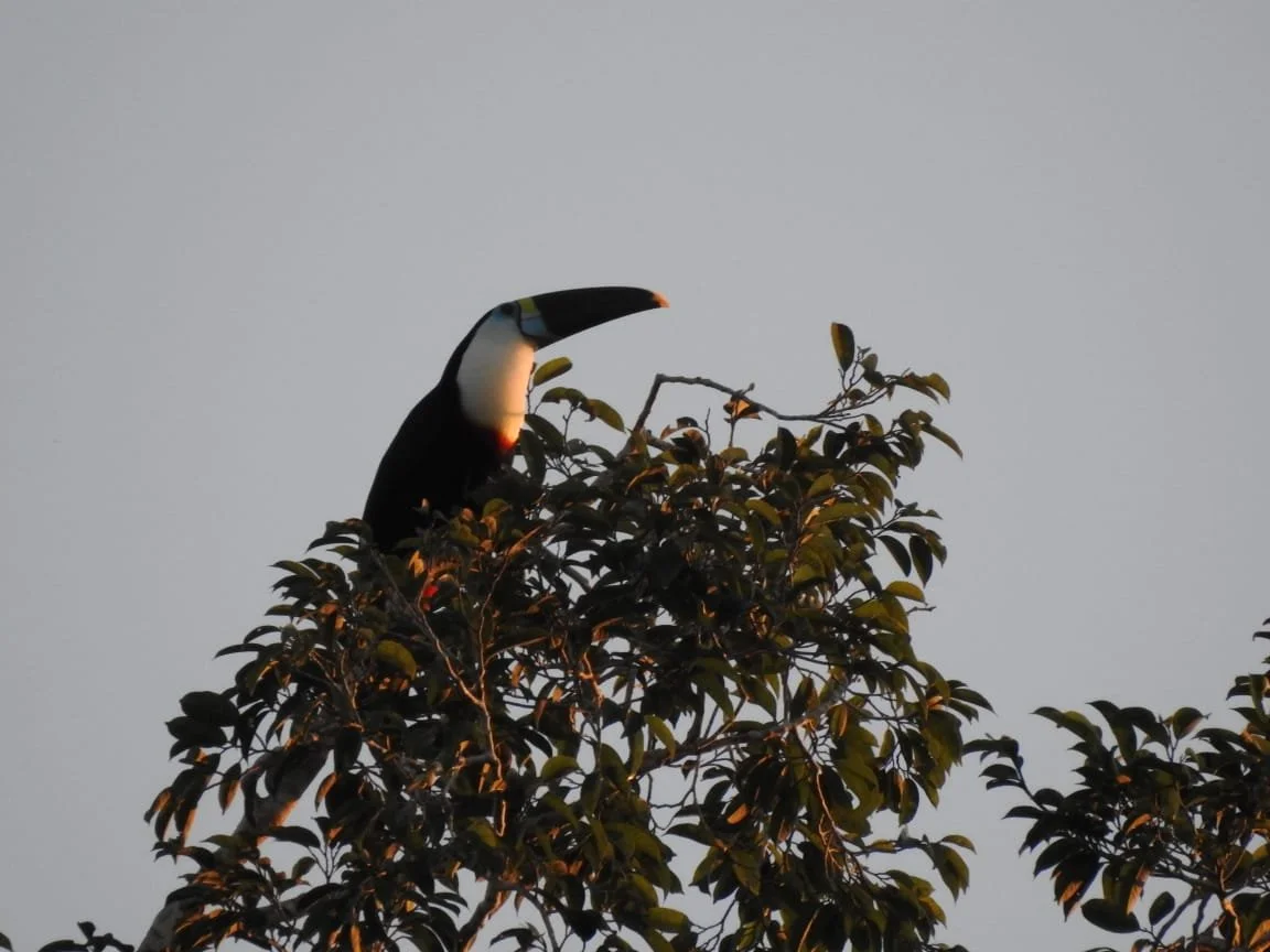 Predators of the Chestnut-eared aracari include larger raptors, including large white hawks and ornate-hawk-eagles. Larger toucan species , such as the red-breasted toucan, have been observed preying on the eggs and nestlings of other toucans and aracaris. Medium-sized mammals , like opossums and monkeys destroy the nests and take eggs as well..
