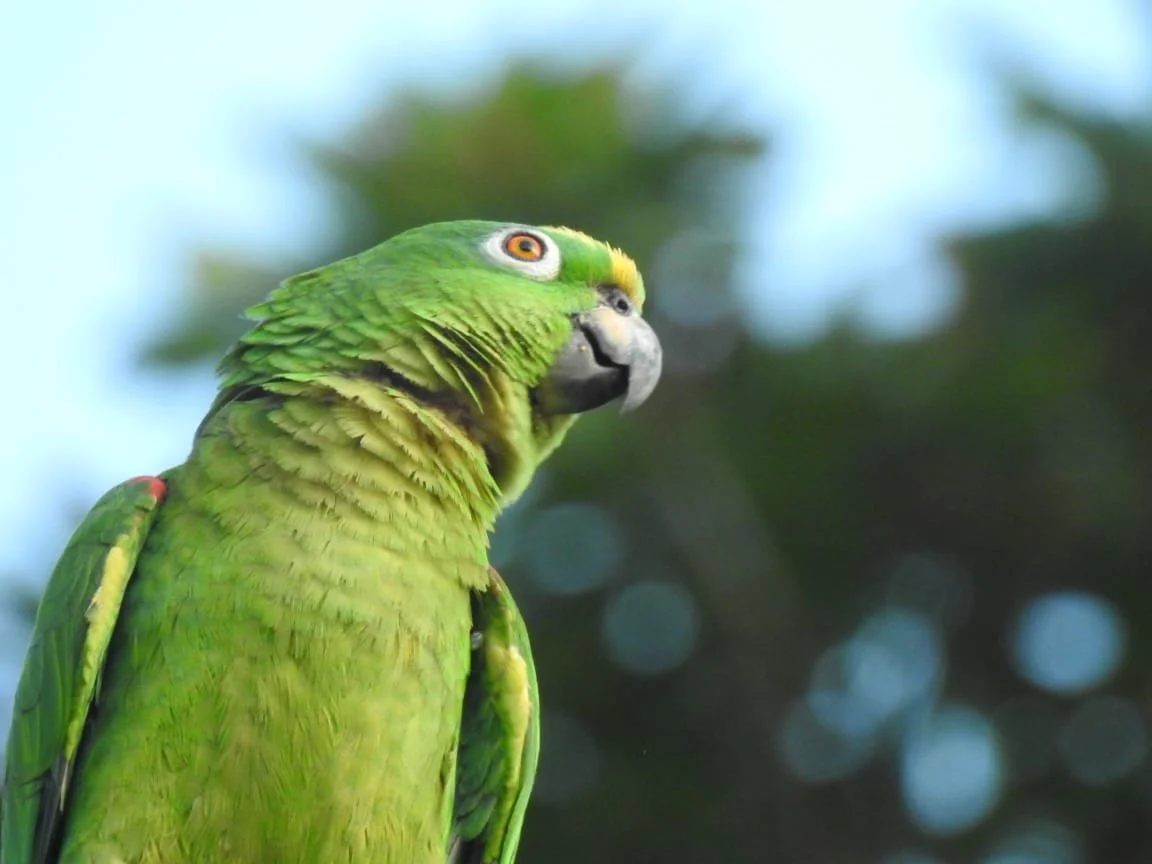 More than 50 species of parrots found in the Peruvian Amazon, including the yellow-crowned Amazon . The yellow-crowned Amazon is a medium sized parrot known for their bright green feathers that have blue tips with red patched wings on them. They have white eye rings and a yellow crown on their head.